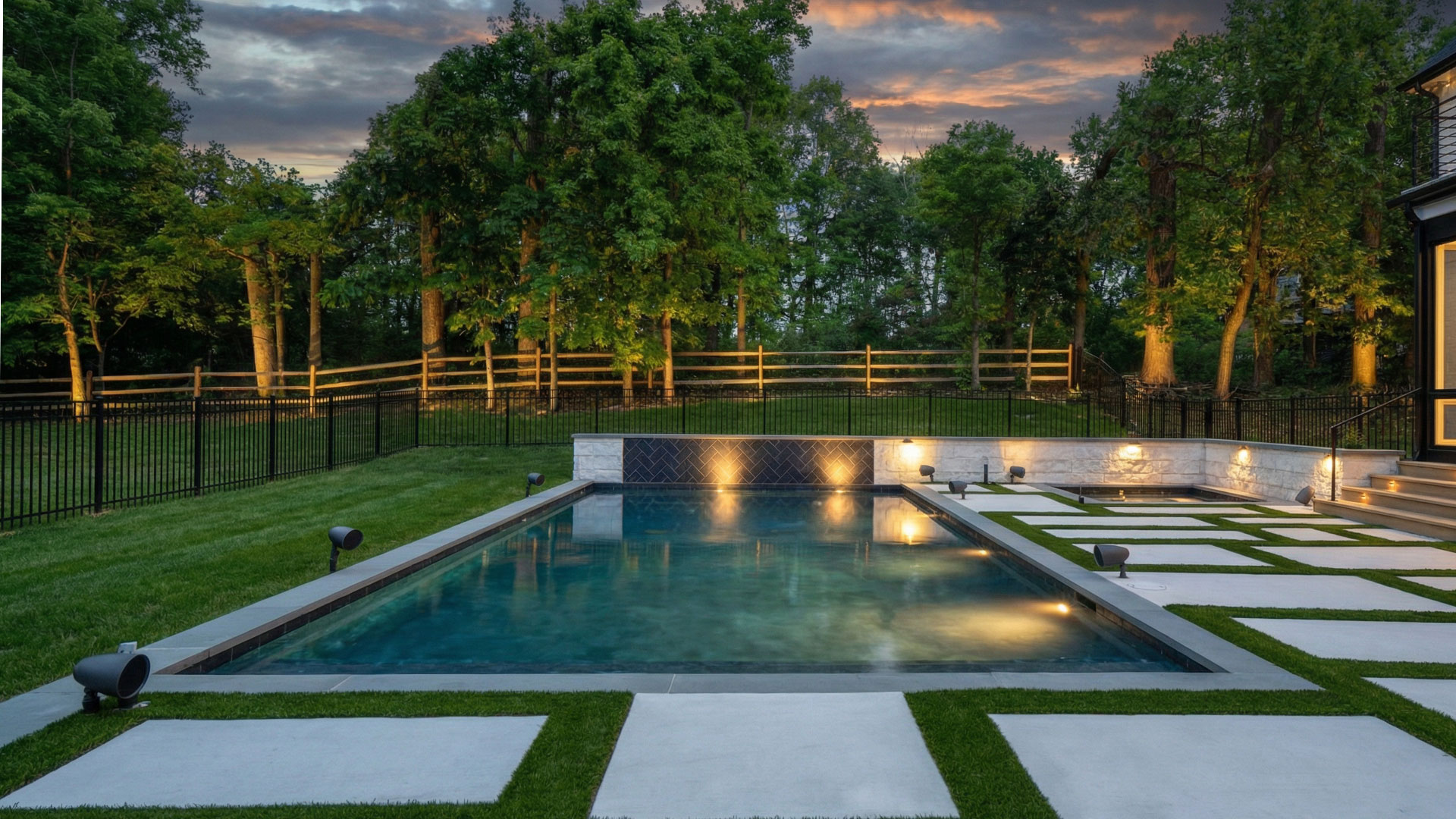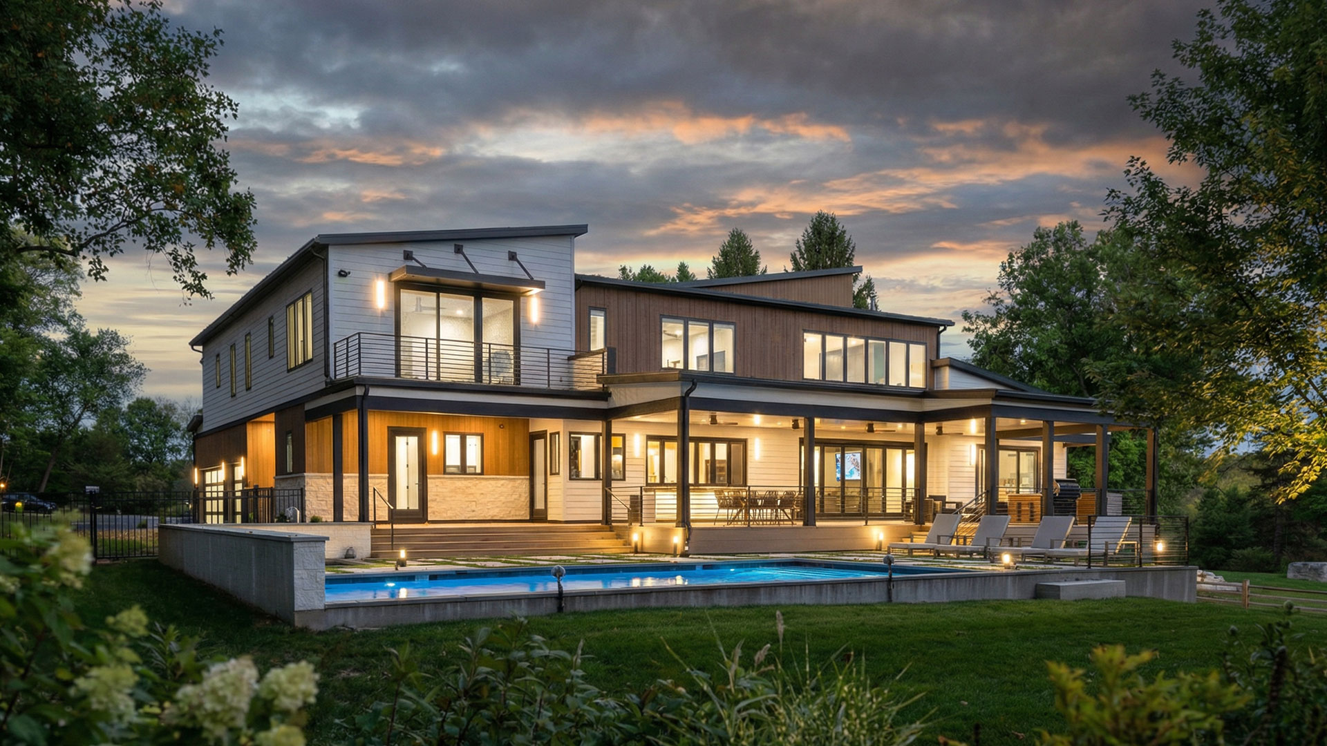 This modern residence pairs sleek architectural lines with a thoughtful, site-sensitive layout designed for both beauty and function. A low-pitched roof, dark window frames, contrasting materials, and stone accents give the home a contemporary yet timeless feel. The façade is composed with care to sit comfortably within its surroundings, while the front auto court and driveway create a welcoming, functional approach.