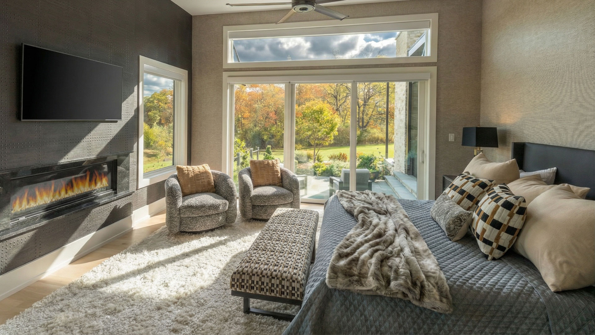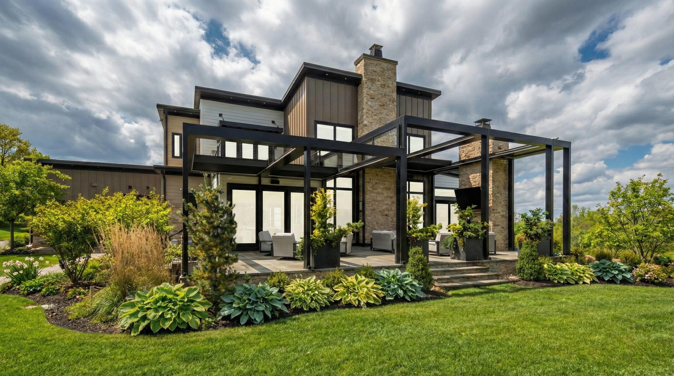 The outdoor retreat is a central feature of the design, providing a private space for relaxation and entertainment. Whether hosting friends or enjoying quiet moments alone, the outdoor area is designed to be a tranquil extension of the home—featuring comfortable seating, natural landscaping, and materials that complement the surrounding landscape. This outdoor space enhances the overall experience of living in harmony with nature, encouraging outdoor leisure and reflection.